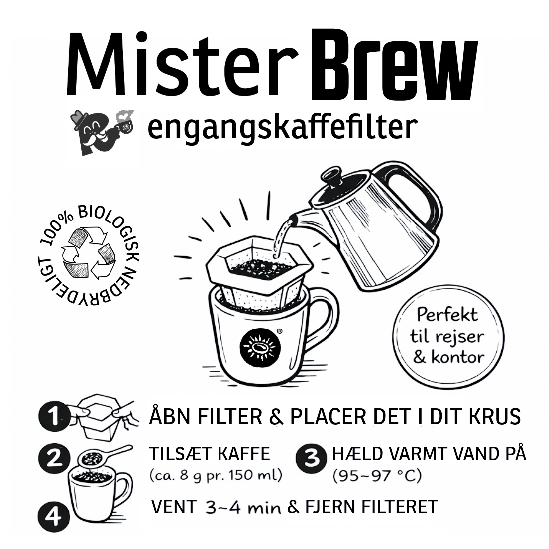 Mister Brew er Risteriets engangskaffefilter til dig der gerne vil brygge en nem enkelt kop på farten eller i frokostpausen!